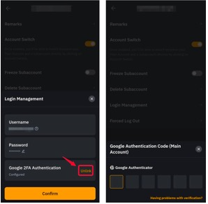 سيُطلب منك إدخال رمز Google Authenticator لحسابك الرئيسي لفك ارتباط التحقق بخطوتين بفاعلية على حسابك الفرعي.