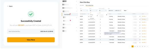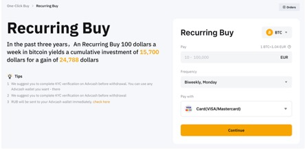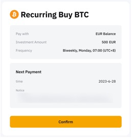 الشراء المتكرر هو طريقة ممتازة لأتمتة شراء العملات الرقمية للمستخدمين الذين يرغبون في استراتيجية استثمار خالية من المتاعب. مع استراتيجية المتوسط الحسابي (DCA)، يمكنك الاستثمار بمبالغ صغيرة متساوية على مدى فترة زمنية محددة، بدلاً من استثمار مبلغ كبير دفعة واحدة، لتسهيل متوسط سعر استثمارك مع الشراء المتكرر دون عناء. لمزيد من التفاصيل، يرجى الرجوع إلى مقدمة في الشراء المتكرر.