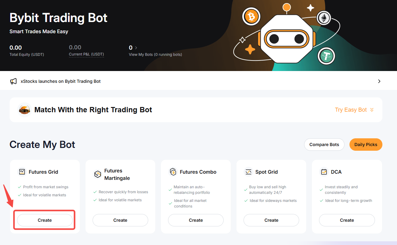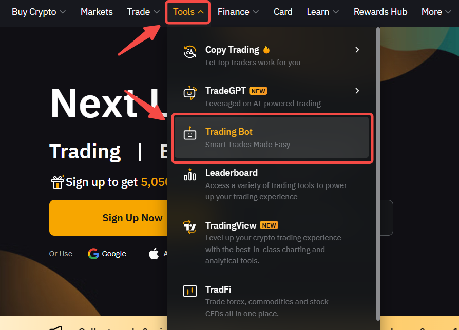 الخطوة 1: يرجى النقر على الأدوات ← بوت التداول في شريط التنقل لدخول صفحة بوت التداول في Bybit.