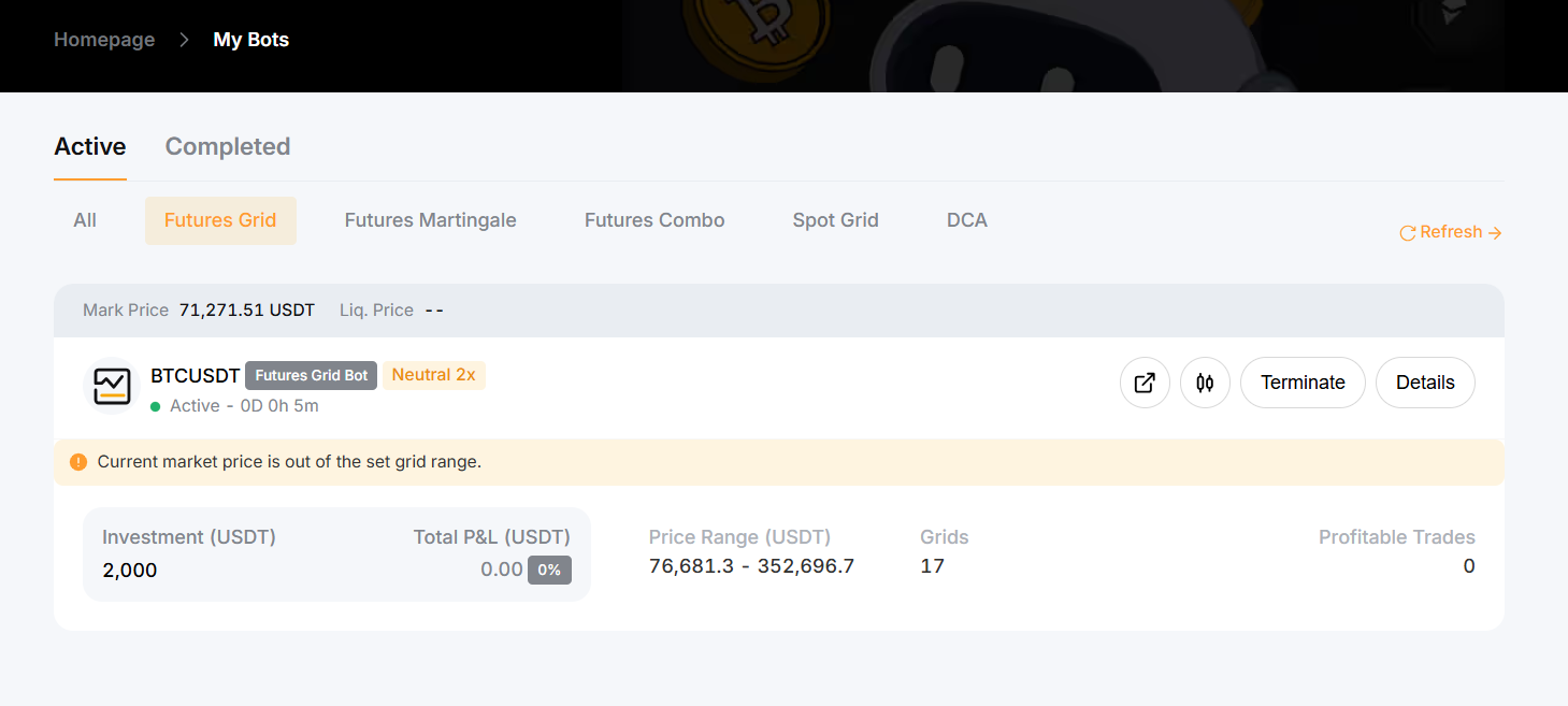 ملحوظة: يمكنك إنشاء ما يصل إلى 50 بوت تداول العقود الآجلة الشبكي.