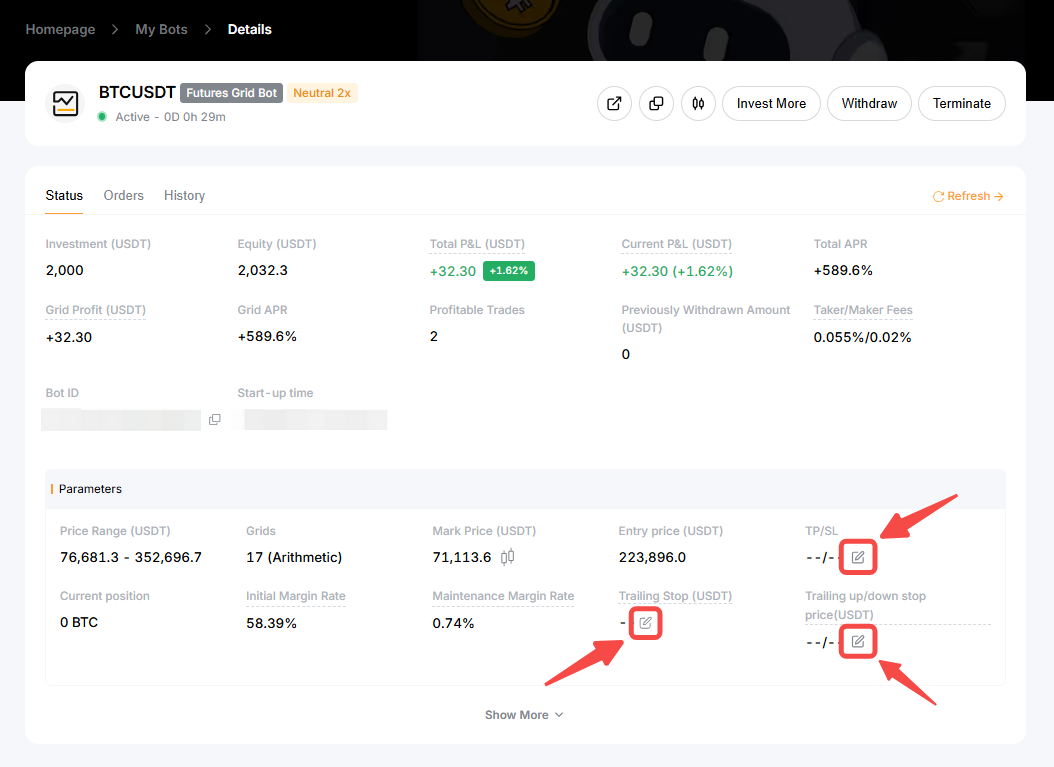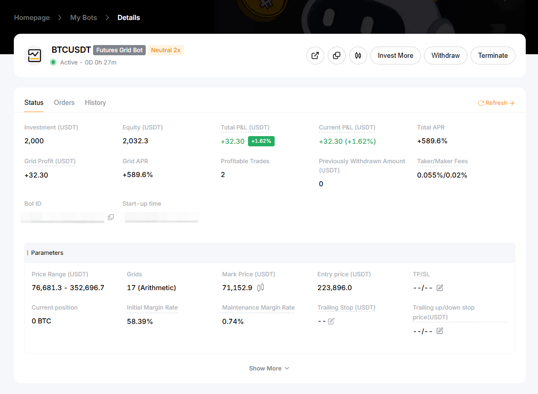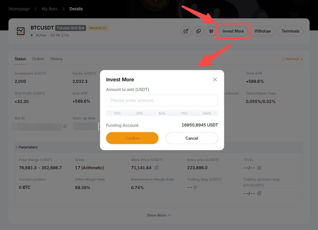بمجرد أن يتم إنشاء بوت تداول العقود الآجلة الشبكي الخاص بك، ستتمكن من استثمار المزيد من الأموال في البوت الشبكي من خلال الذهاب إلى صفحة التفاصيل الخاصة ببوت تداول العقود الآجلة الشبكي والنقر على استثمر المزيد.