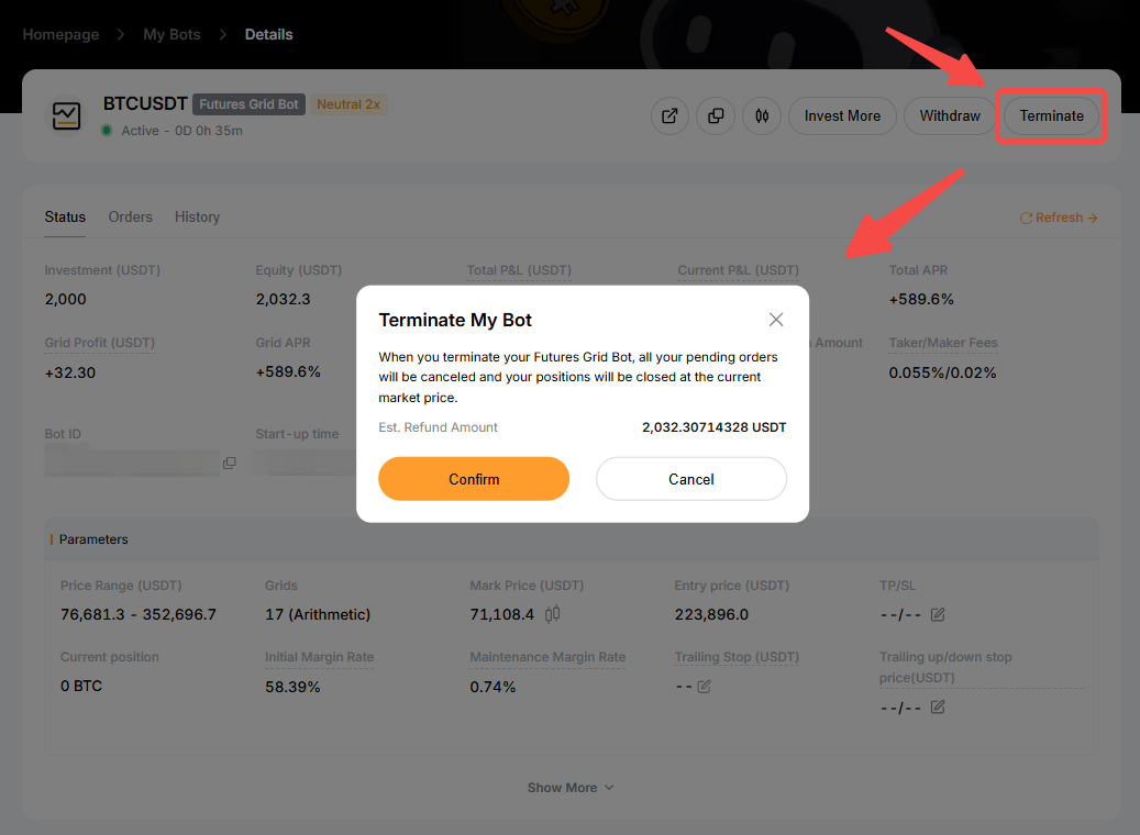 لإنهاء بوت تداول العقود الآجلة الشبكي الخاص بك، انتقل إلى صفحة التفاصيل الخاصة ببوت تداول العقود الآجلة الشبكي وانقر على إنهاء.