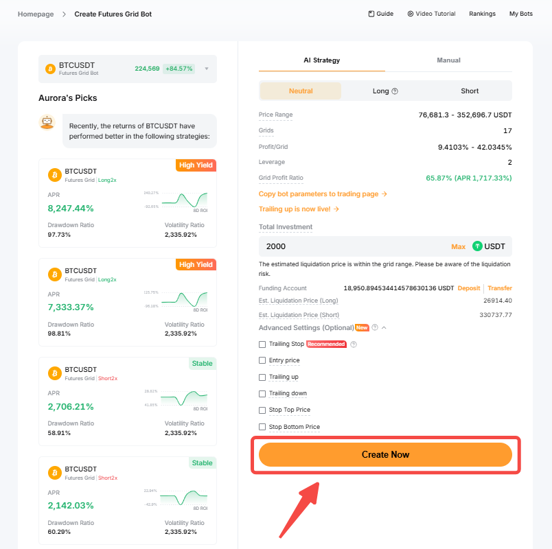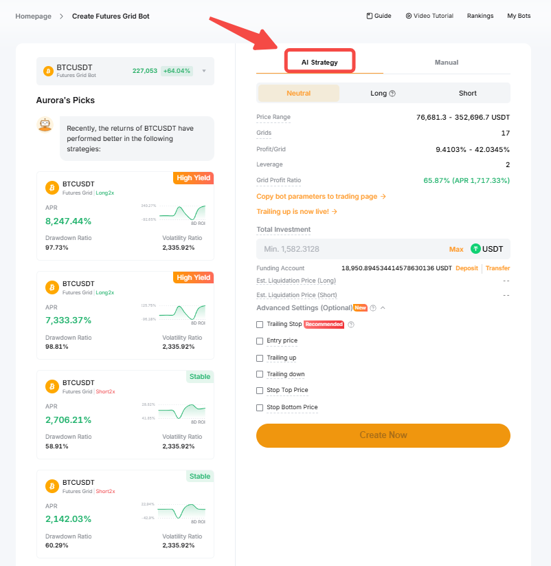 باستخدام استراتيجية الذكاء الاصطناعي، سيقوم النظام باقتراح العوامل بناءً على أداء البيانات التاريخية لزوج تداول العقود الآجلة. وكبديل، يمكنك أيضًا الرجوع إلى اقتراحات اختيارات أورورا لإنشاء بوت تداول العقود الآجلة الشبكي بناءً على تفضيلاتك.