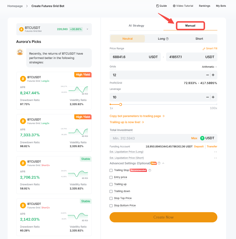 يمكنك إنشاء بوت تداول العقود الآجلة الشبكي يدوياً عبر كل من صفحة بوتات التداول وصفحة تداول العقود الآجلة.