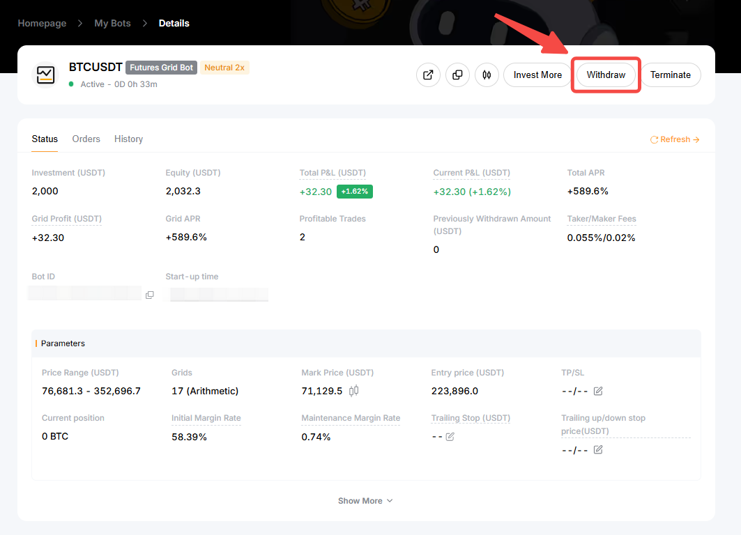 لسحب أرباح بوت تداول العقود الآجلة الشبكي الخاص بك، انتقل إلى التفاصيل الخاصة بالبوت الخاص بك واضغط على سحب.