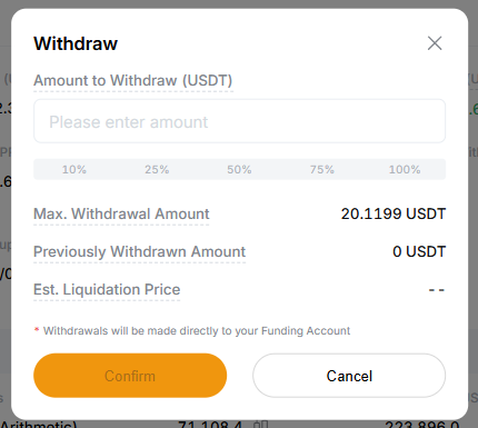 الحد الأقصى للمبلغ الذي يمكن سحبه هو ربح الشبكة بعد خصم الرسوم. يمكنك الرجوع إلى الحد الأقصى. مبلغ السحب الذي يُعرض في نافذة السحب. سيتم إيداع المبلغ المسحوب في حساب التمويل الخاص بك.