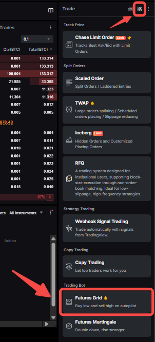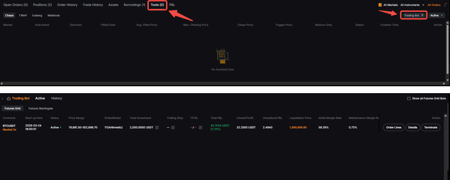 يمكنك أيضًا رؤية تفاصيل بوت تداول العقود الآجلة الشبكي النشط أو المغلق على صفحات تداول العقود الآجلة بالنقر على أدوات → بوت التداول.