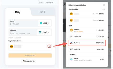 الخطوة 2: بعد اختيار العملة الورقية، العملات والمبلغ الذي تريد دفعه، اختر بطاقة الائتمان/الخصم التي أضفتها وانقر على شراء باستخدام.