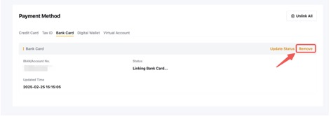 الخطوة 3: اختر البطاقة التي تريد إزالتها من القائمة، انقر فوق إزالة البطاقة واضغط على تأكيد إذا كنت توافق على فك الرابط عن البطاقة.