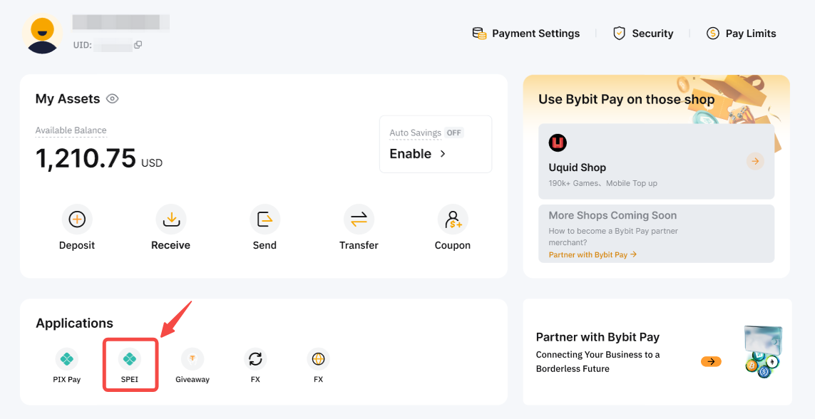 Step 1: Go to the Bybit Pay page by clicking on Finance → Bybit Pay. Then, click on SPEI (for SPEI Transfers) to open the transfer interface and begin your transfer.