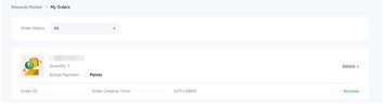 يمكنك العثور على سجلات حالة الاسترداد الخاصة بك في صفحة طلباتي. بالنقر على التفاصيل، يمكنك الوصول إلى جميع المعلومات المتعلقة باسترداد المكافآت، بما في ذلك معرف الطلب، وقت الإنشاء، وقت الإكمال، نوع العملة، العملة، مبلغ المكافأة، ومبلغ دفع النقاط.