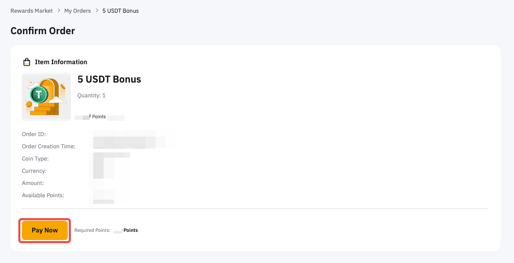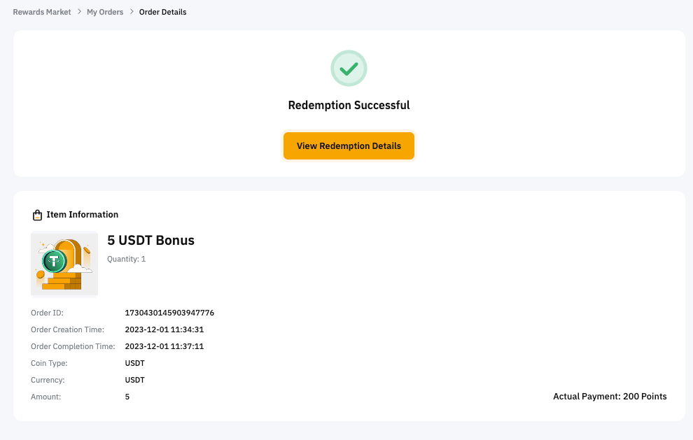 يمكنك العثور على سجلات حالة الاسترداد الخاصة بك فيصفحة الطلبات الخاصة بي. عند النقر على التفاصيل، يمكنك الوصول إلى جميع المعلومات المتعلقة بالاسترداد، بما في ذلك رقم التعريف الخاص بالطلب، وقت الإنشاء، ميعاد الانتهاء، نوع العملة، عملة، مبلغ المكافأة، ومبلغ دفع النقاط.