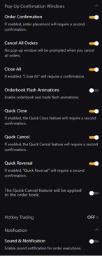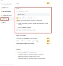 | يتيح لك تمكين الأنواع المختلفة من نوافذ التأكيد الحصول على تأكيد ثانٍ قبل وضع الأمر ويمنعك من ارتكاب أخطاء في وضع الأمر أو تعديله. توصي Bybit بشدة أن يكون لديك على الأقل نوافذ تأكيد الأمر والعكس السريع وإغلاق الكل وإلغاء الكل لتجنب أي إجراءات خاطئة. |
