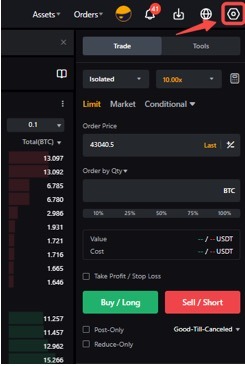 ستوفر الإعدادات في صفحات التداول المزيد من الخيارات لأنشطة التداول الخاصة بك. للوصول إلى قائمة الإعدادات، ما عليك سوى النقر على أيقونة الإعدادات في الزاوية العلوية اليمنى من الصفحة.