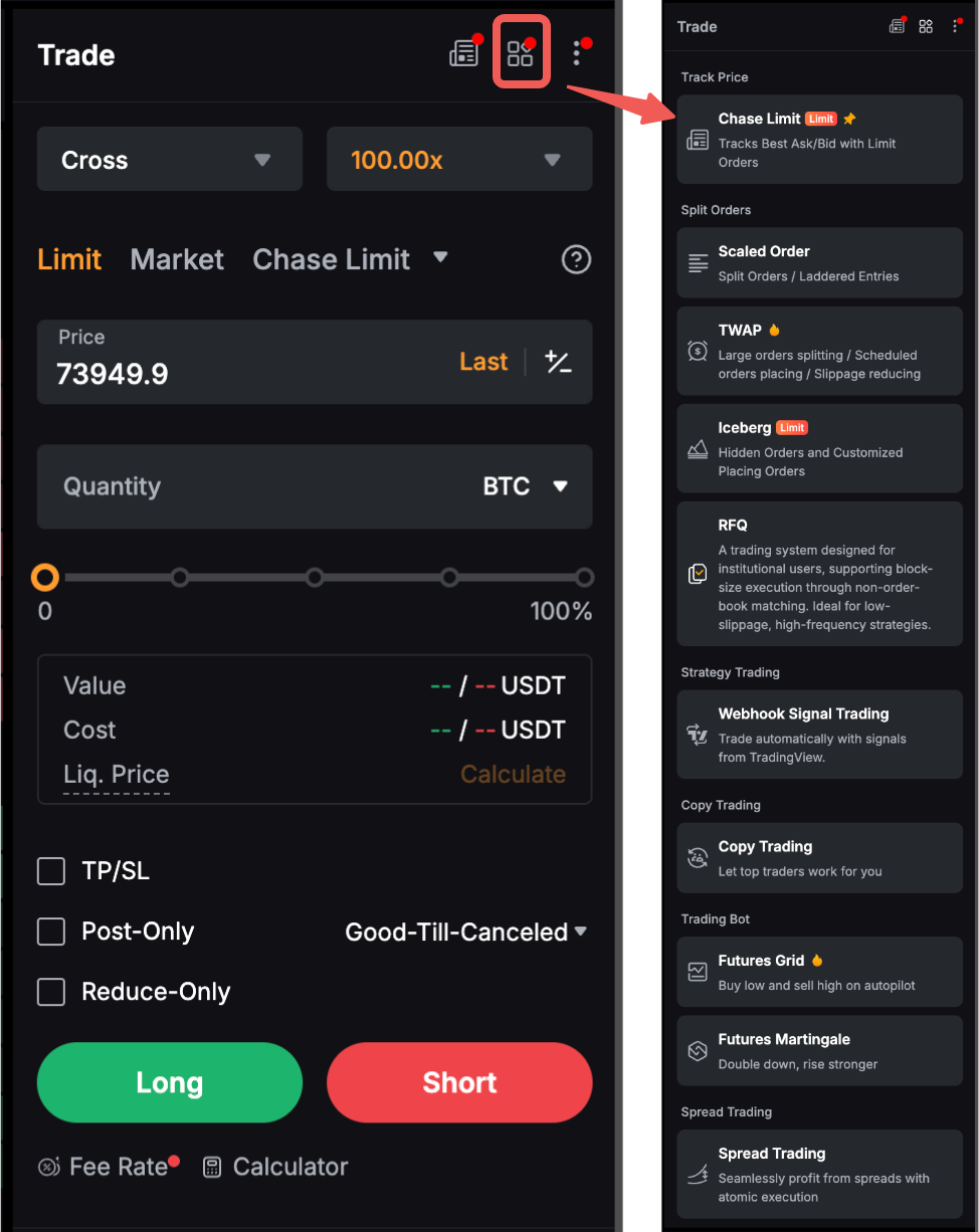 تتبع السعر وتقسيم الأوامر | استخدم أنواع طلباتنا المتقدمة لتعزيز الاستراتيجية الخاصة بتداولك. بمجرد اختيارك للطلب الذي تفضله، سيتم تحديث منطقة الطلب لتقوم بتعبئة تفاصيل الطلب اللازمة. إذا كانت لديك أي شكوك حول متى وكيفية استخدام أنواع الطلبات المختلفة المتاحة على Bybit، يرجى مراجعة هذا الدليل. |