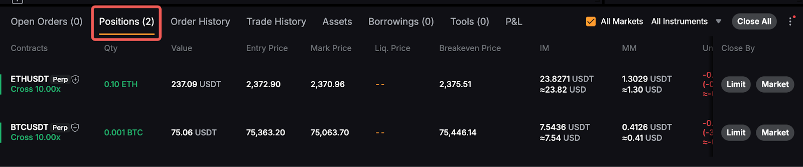 عقود | يعرض هذا زوج التداول للموقع الذي تحتفظ به حاليًا. سترى أيضًا وضع الهامش والتأثير المستخدمين لكل موقع. إذا كنت تحتفظ بأكثر من موقع عبر أزواج تداول مختلفة، يمكنك تحديد المربع جميع الأسواق . يمكنك أيضًا تصفية العرض بناءً على نوع عقد المشتقات (أي، العقود الدائمة فقط، عقود الاستحقاق فقط، أو عقود الخيارات فقط) عبر القائمة المنسدلة جميع الأدوات. اقرأ المزيد: |