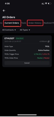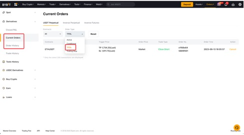 بالنسبة لأوامر TP/SL غير المفعلة، يمكنك التحقق من الأوامر الحالية بينما بالنسبة للأوامر TP/SL المفعلة أو الملغاة، يمكنك رؤيتها من سجل الأوامر.