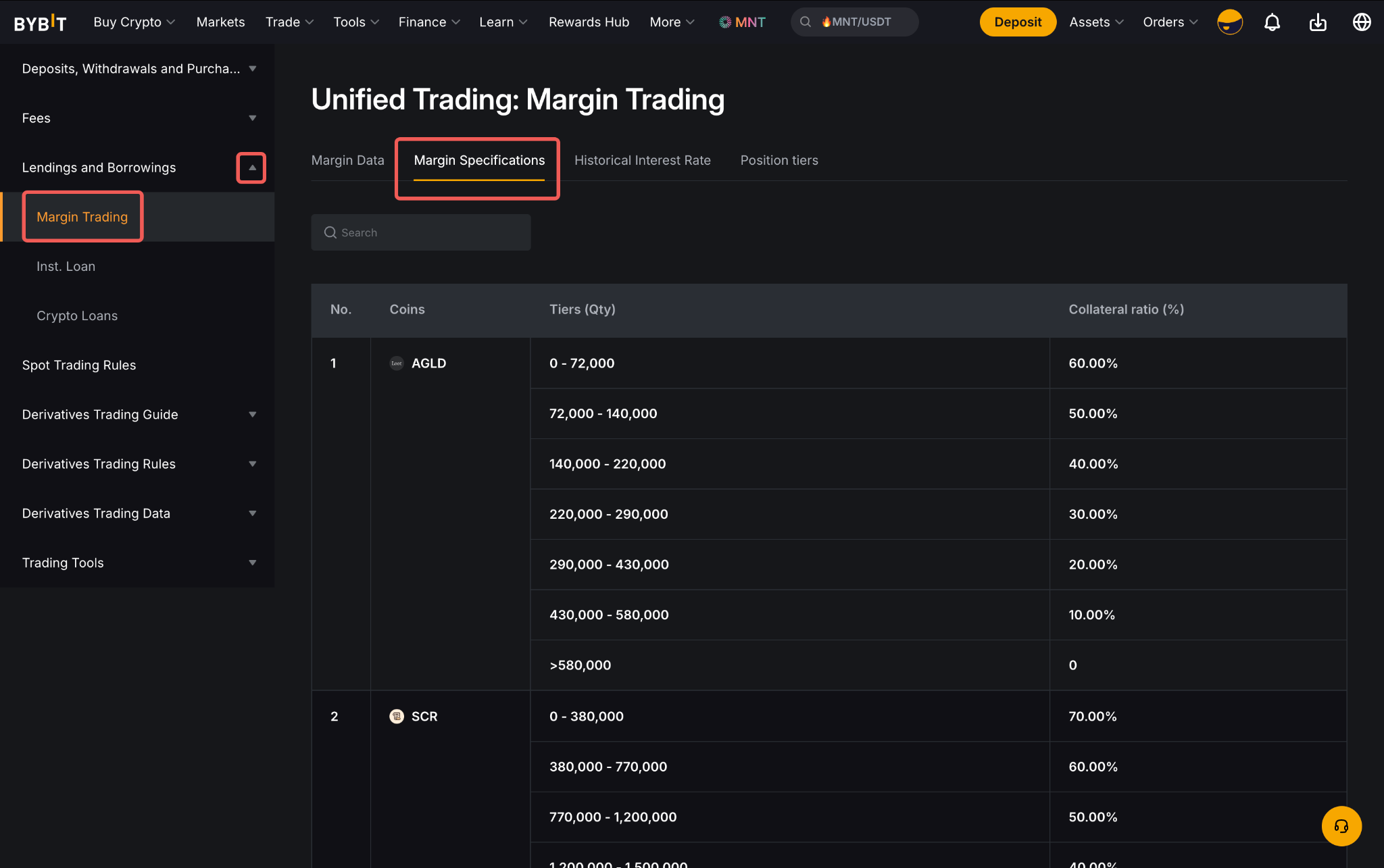 To view the collateral and borrowable asset details, go to the Derivatives Trading Page and click on Derivatives Info. Then, click Lending and Borrowings Margin Trading → Margin Specification.