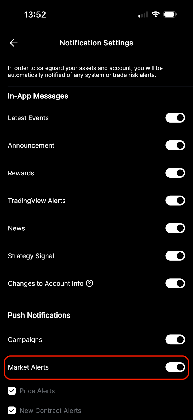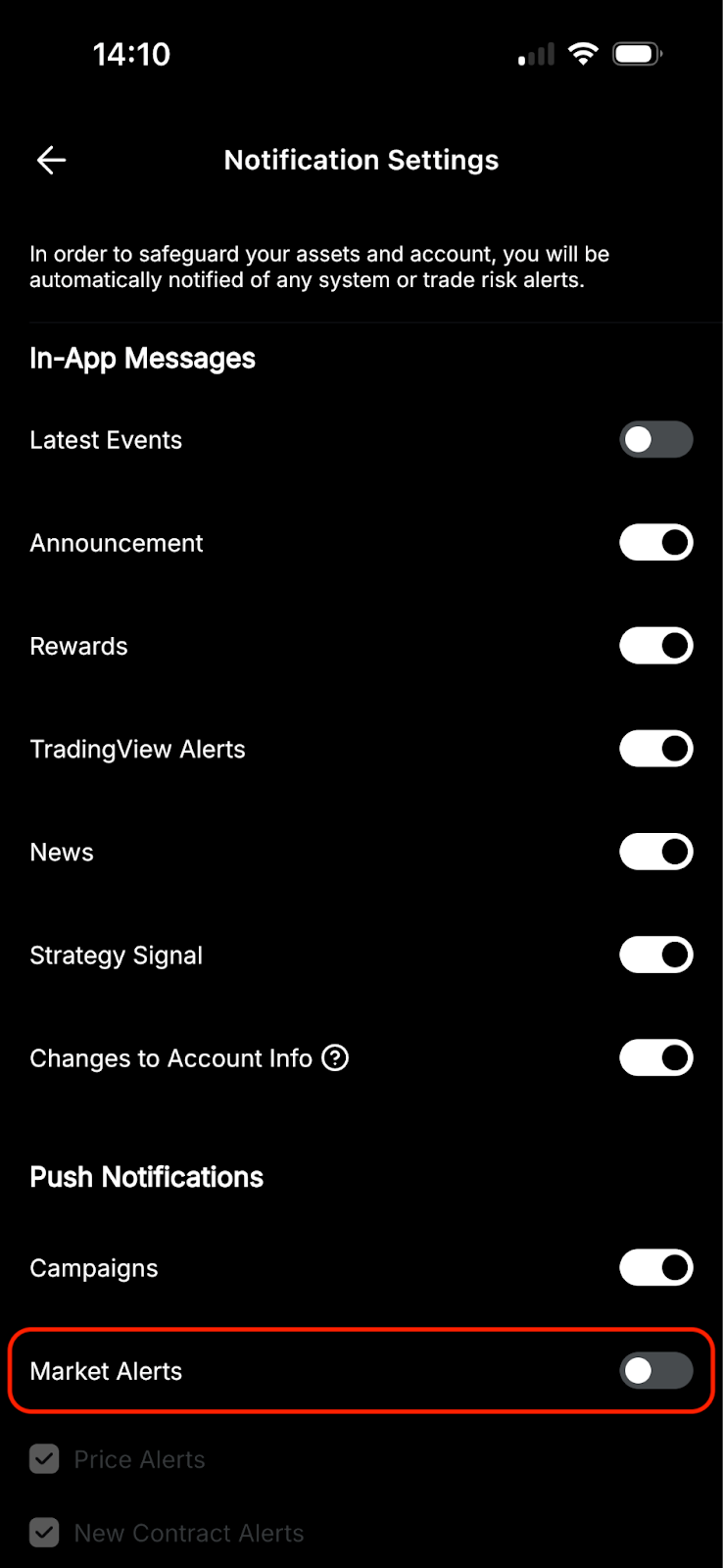 To turn off Bybit’s Market Alerts, you can go to the Settings page by clicking on the profile icon on the top left corner of the homepage and clicking on the Settings icon. Then, click on Preference → Notification Settings, where you can define the type of notifications you want to receive on your phone from the Bybit App.