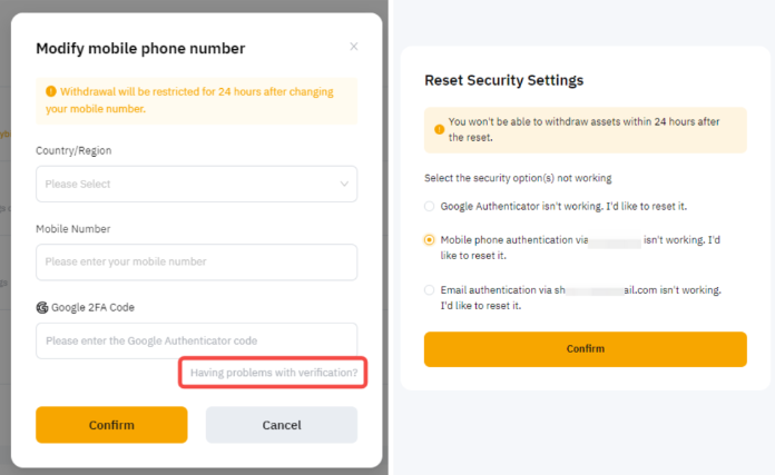 On the 2FA authentication window, you can click on Having problems with verification to select the verification method that is not working. Fill in the information, and once your request is approved, our customer support will help you reset your 2FA authentication.
