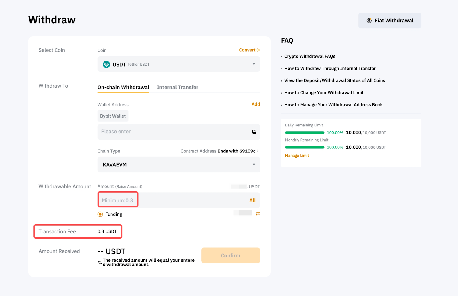 Bybit charges a fixed fee for all withdrawals and dynamically adjusts the batch transfer miner fee to a higher level to ensure faster confirmation speeds of withdrawals on the blockchain.