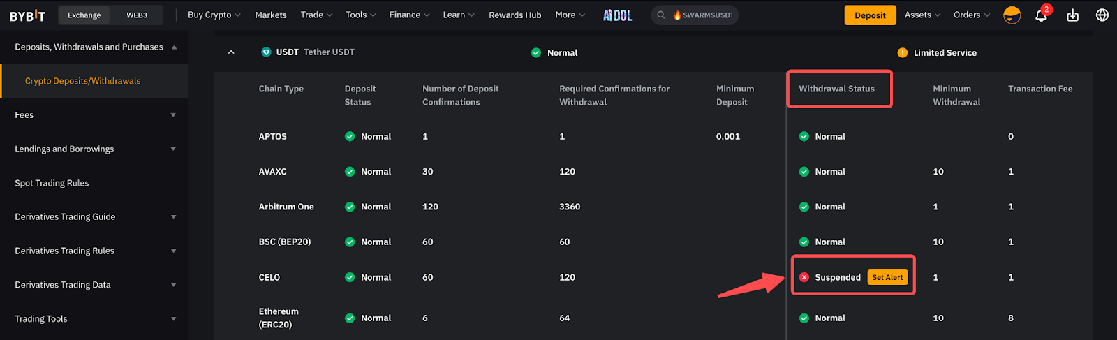 Alternatively, you can go to the Deposit/Withdrawal status page and search for the token and chain. The Set Alert button will be visible next to the “Suspended” deposit status.
