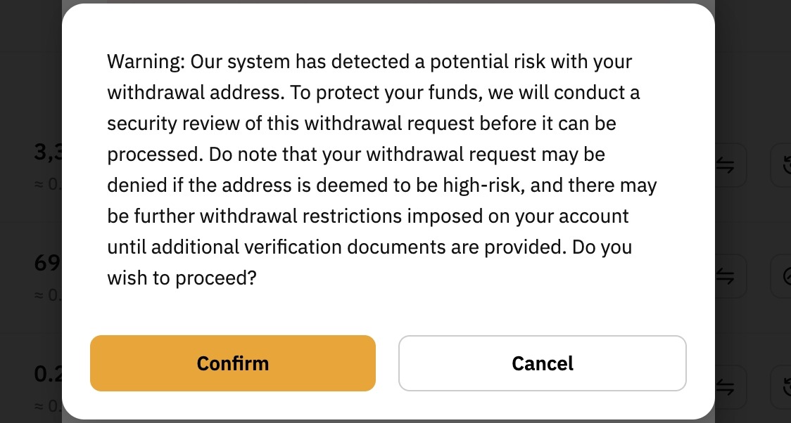 If you still wish to proceed with the same address, the withdrawal request may be rejected if the address is deemed high-risk. Your account may be subject to a withdrawal restriction until additional verification documents are provided via email, if required.