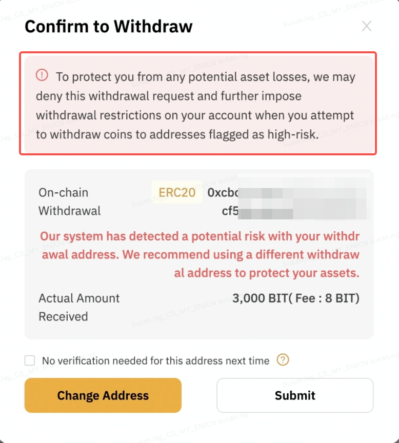 If you still wish to proceed with the same address, the withdrawal request may be rejected if the address is deemed high-risk. Your account may be subject to a withdrawal restriction until additional verification documents are provided via email, if required.