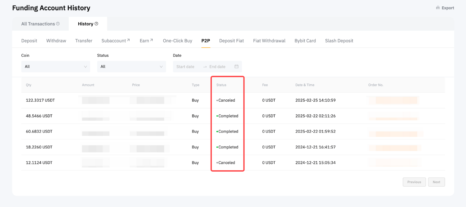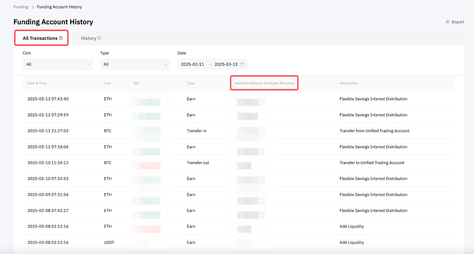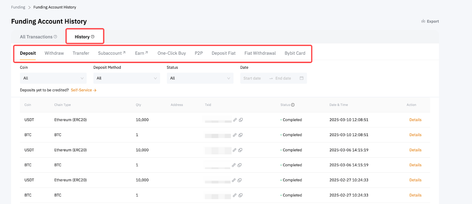 By default, you will be directed to the All Transactions tab where you can see all past transactions that have affected the available balance on your Funding Account. Such transactions include past records of crypto/fiat deposits and withdrawals, inter-account transfers (UTA, Bybit Earn & trading bots), yields from your active investments, conversions, and so on.