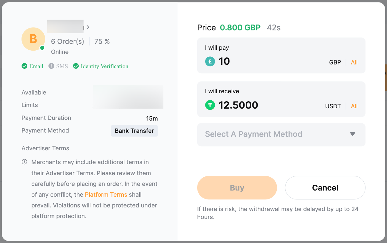 — Failing to transfer the funds to the Seller within the set timer or insufficient balance in your Bybit account will automatically cancel your order.