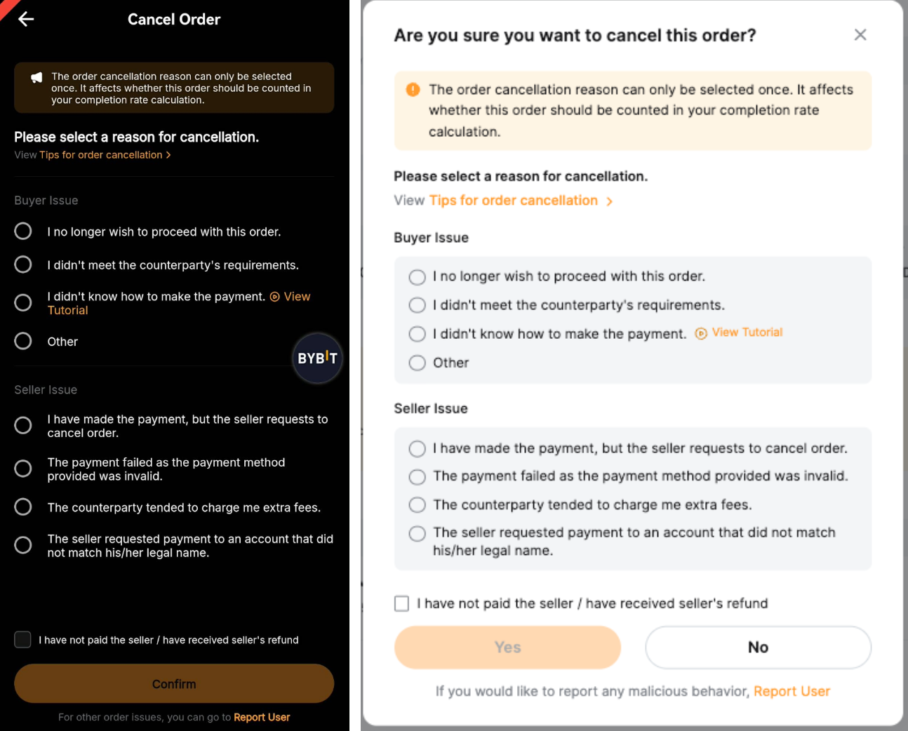 4. BUYERS may cancel P2P orders up to 3 times within 24 hours. If the cancellation reason is due to the Buyer Issue, and once the cancellation limit is reached, the P2P trading function will be restricted for 24 hours.