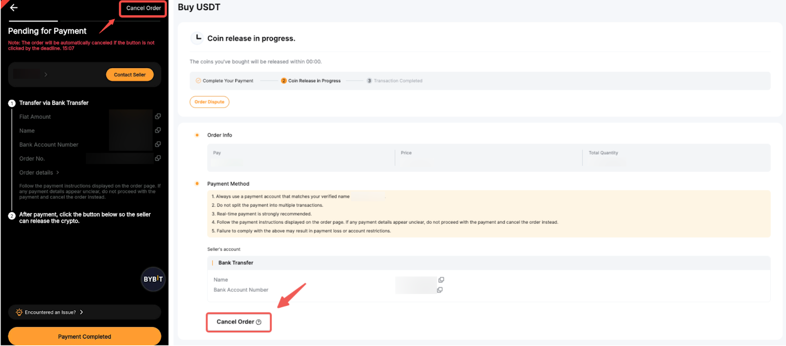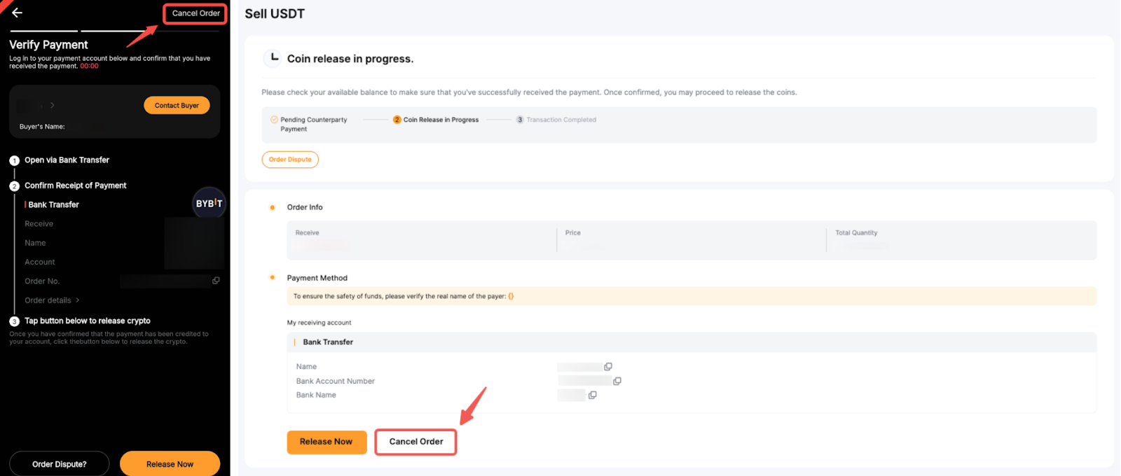 a. BUYERS can cancel an order when the order status is Pending Payment or Coin Release in Progress.