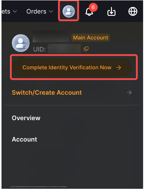Step 1: Click on the profile icon on the right side of the navigation bar, then click on Complete Identity Verification Now.