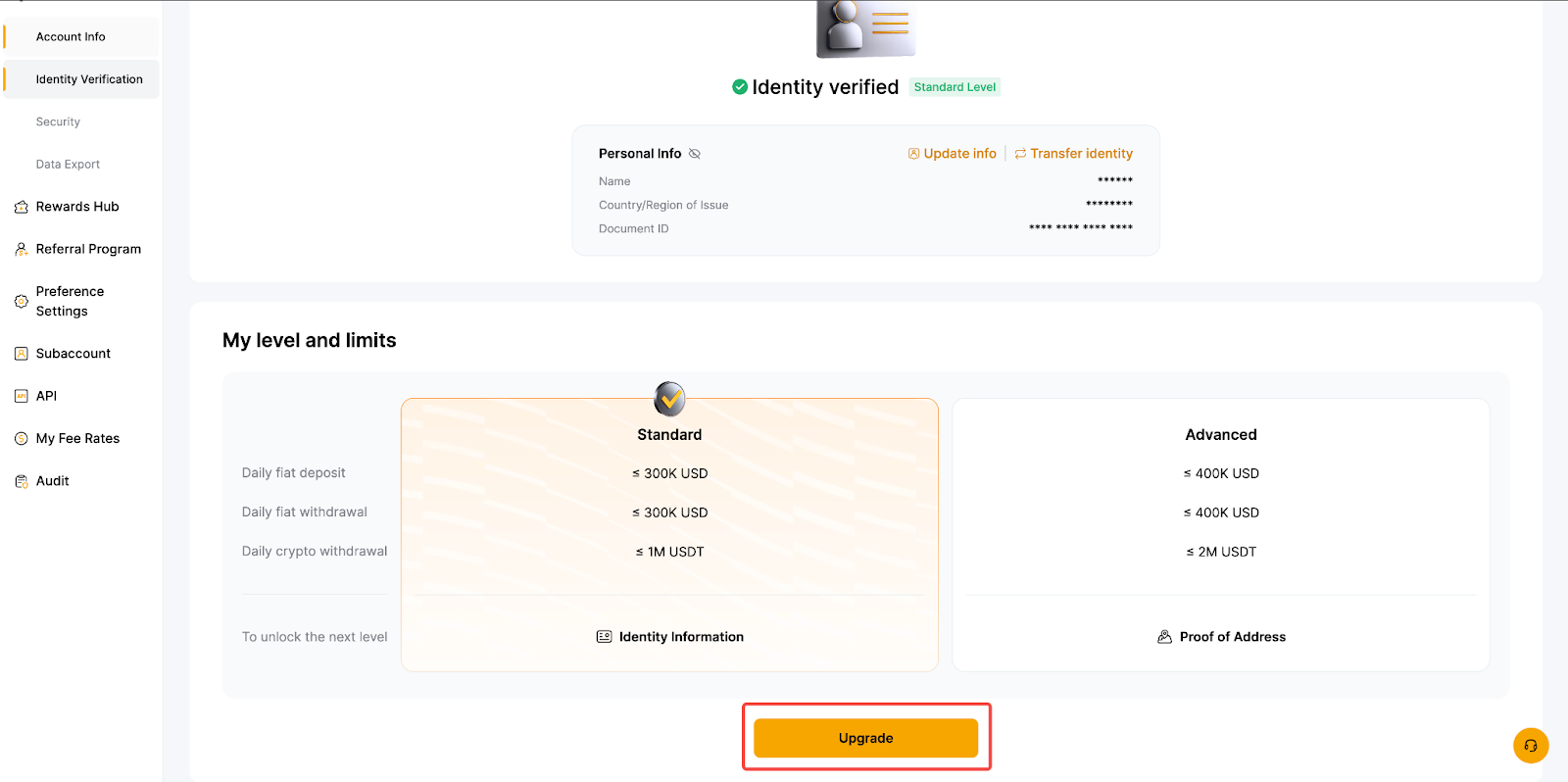 Individual identity verification is divided into two levels: Standard and Advanced. The differences in benefits and withdrawal limits between these two levels can be found in Benefits of Different KYC Levels. This article provides a step-by-step guide for completing Standard and Advanced Level identity verification.