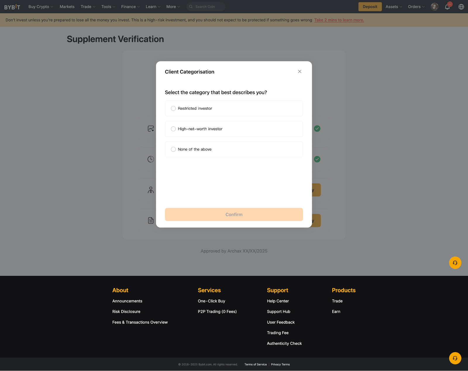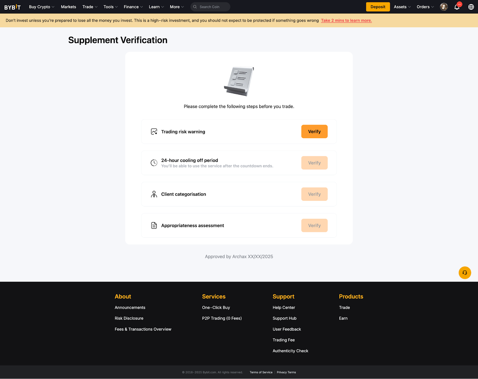 – If you have any compliance-related questions or submit an appeal regarding your Supplement Verification result, please contact our compliance team at complianceops@bybit.com for further assistance.