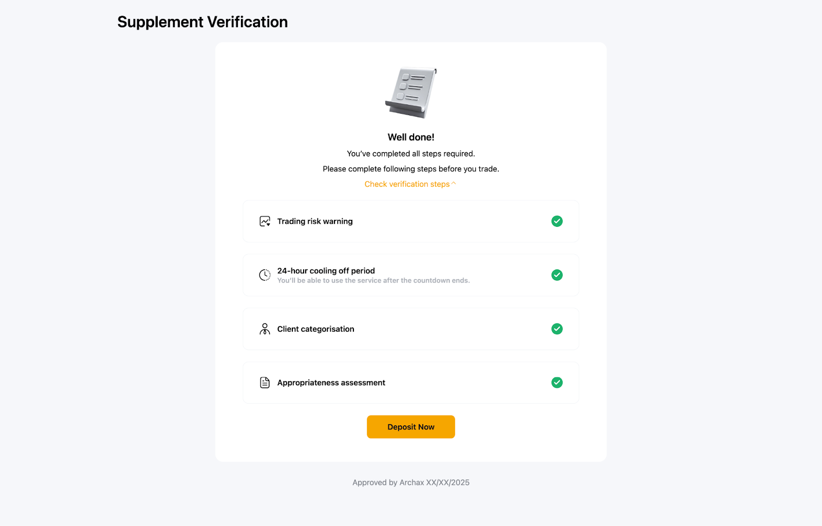 You can now deposit and start trading after you have fully completed the supplement verification. For more details, you can refer to this article: FAQ — Individual KYC.