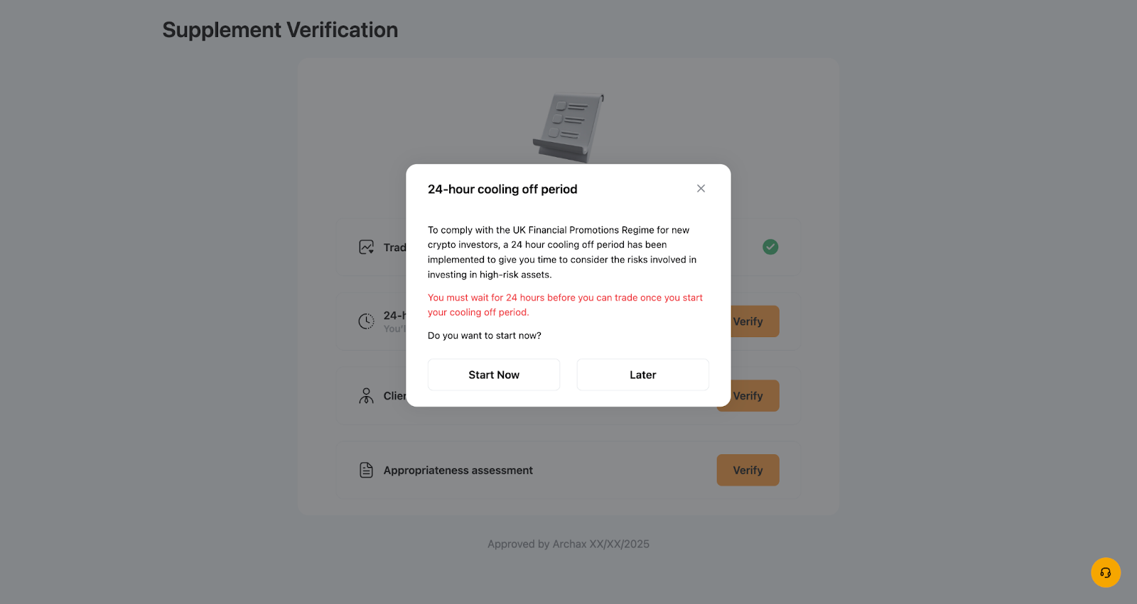 Note: Selecting “Later” will end the current session, and the status will remain incomplete. If you wish to continue accessing the related services, please return to the KYC page to complete the remaining verification steps.