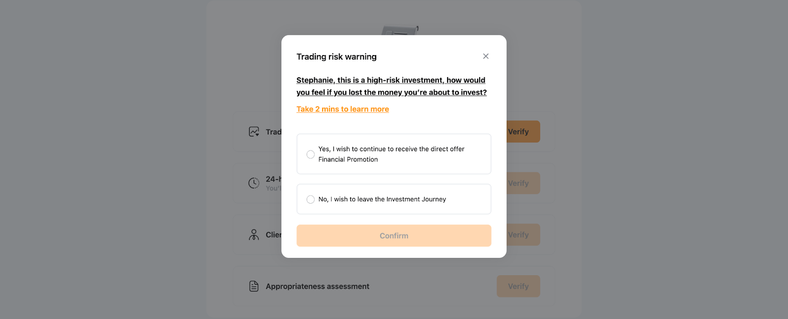 Note: Selecting “No, I wish to leave the Investment Journey” will end the current session, and the status will remain incomplete. If you wish to continue accessing the related services, please return to the KYC page to complete the remaining verification steps.