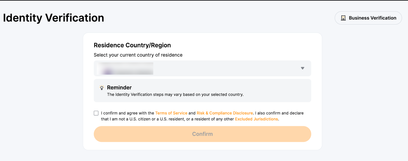 Step 2: Select your current country of residence. Please select the accurate residence country and region, as they can influence your verification process. Additional verification may be required if you wish to make changes after confirmation.