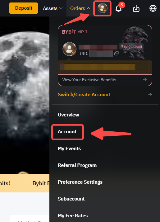 Step 1: Log in to your Bybit account and proceed to Account by clicking the profile icon in the top right corner of the Bybit page.