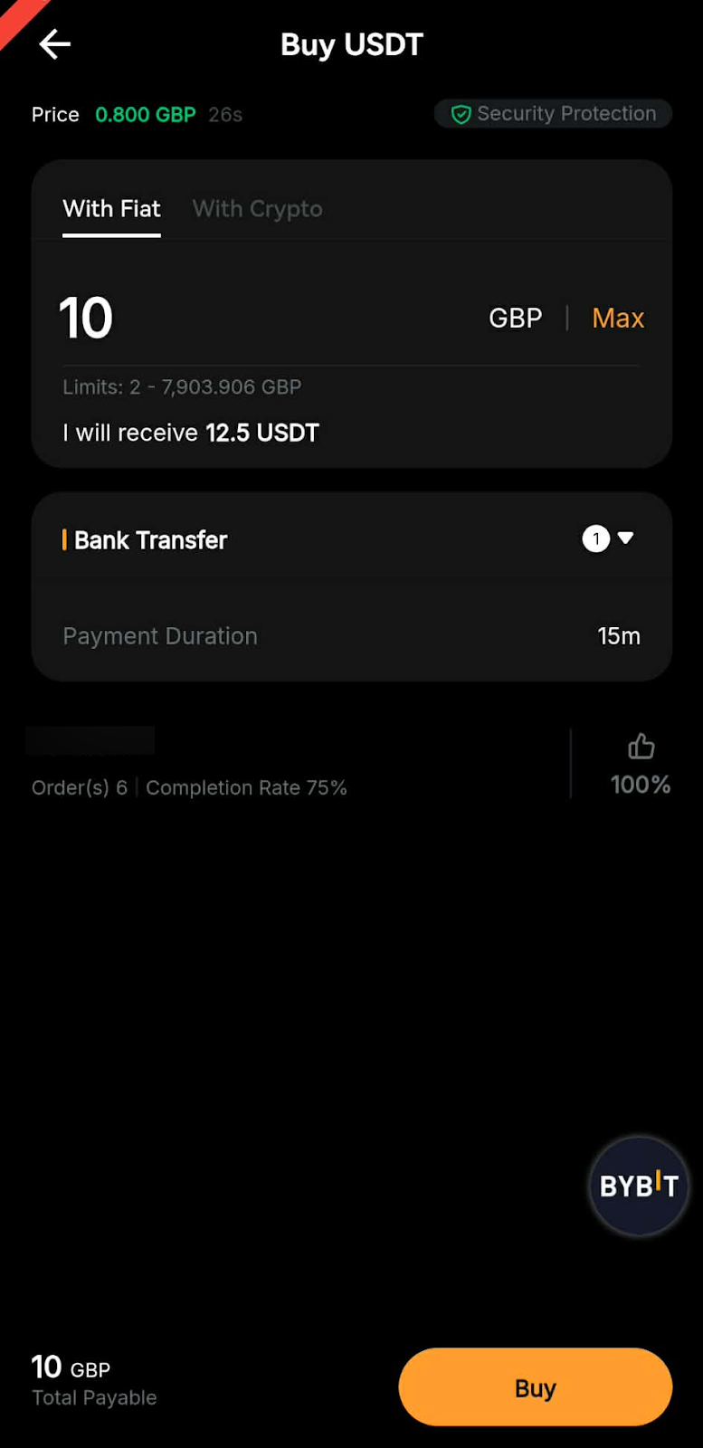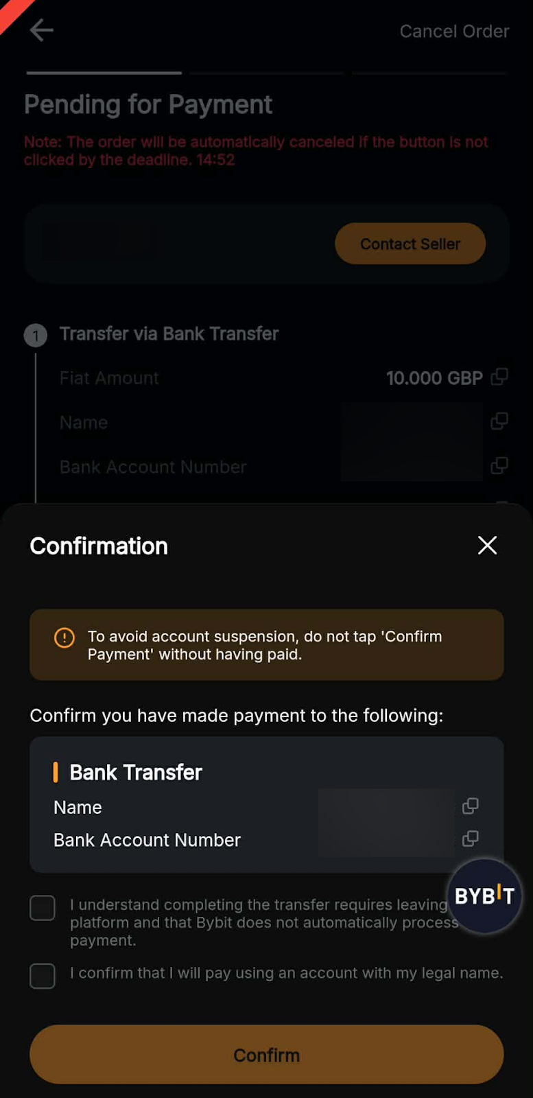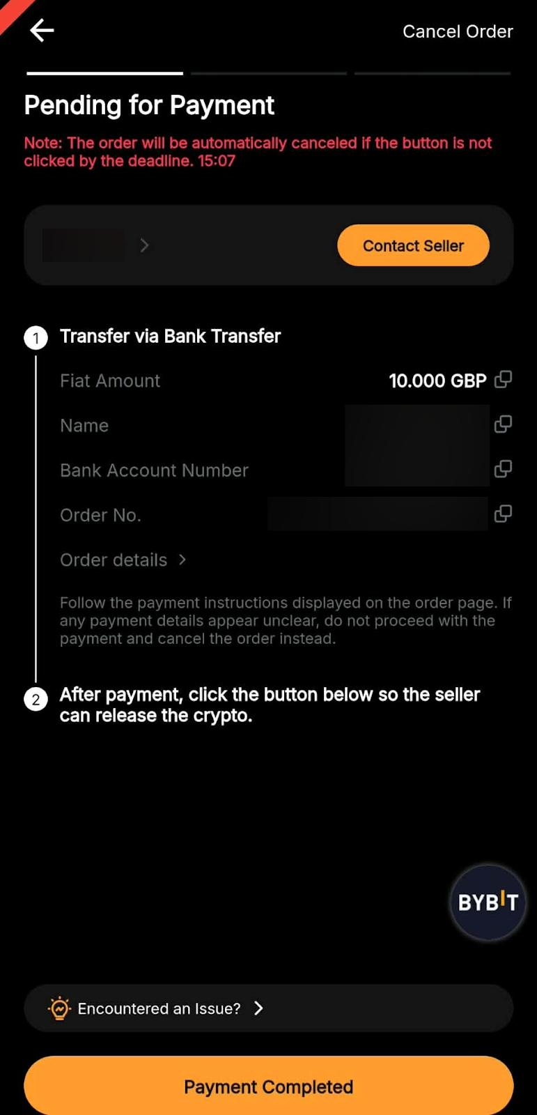 You’ll be redirected to the order page, where you will need to transfer your fiat to the seller’s bank account within the specified time. Please verify that all of your order details are correct before proceeding.