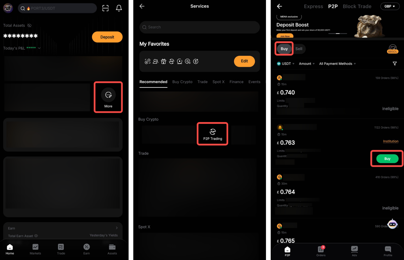 Step 1: Please click on More → P2P to enter the P2P trading page. If you want to buy USDT, then go to the Buy tab, choose your preferred advertisement, and click on Buy.
