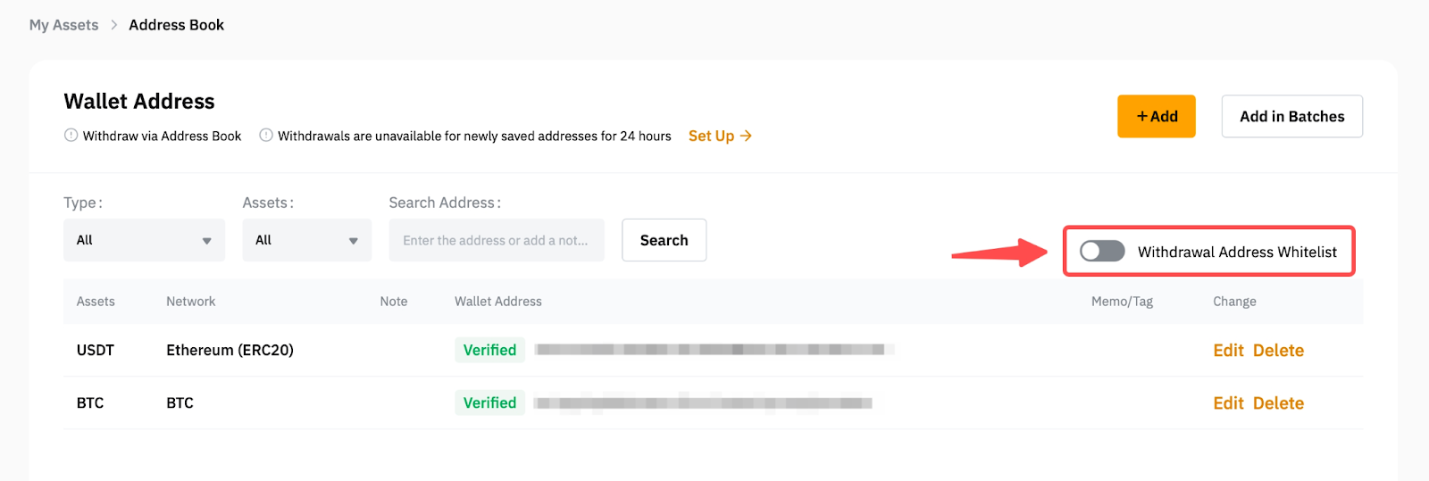 Step 5: Once the verification of the wallet address is done, please activate the Withdrawal Address Whitelist function on the top right corner of the page in order to whitelist the verified wallet address in your withdrawal function.