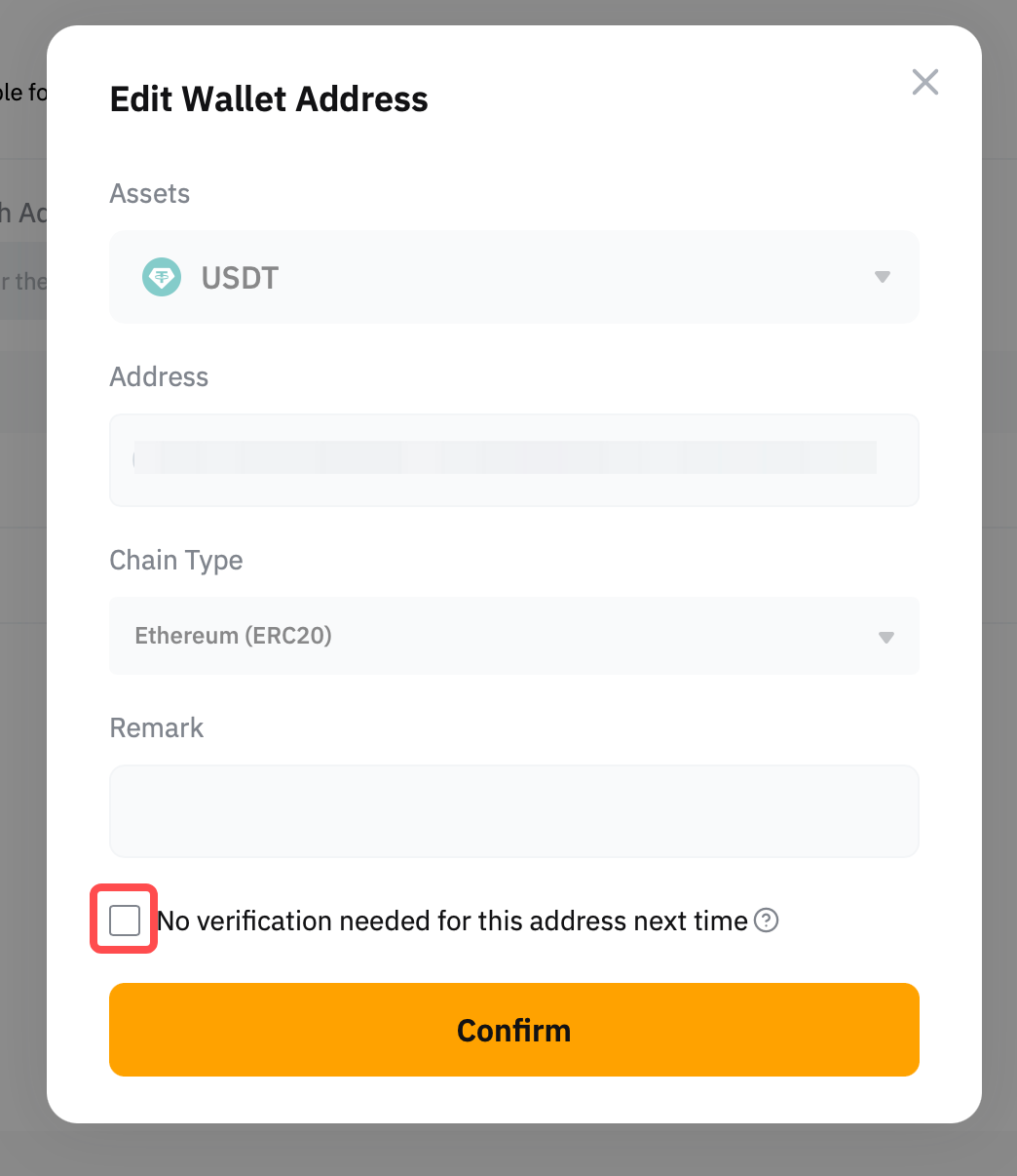 Step 3: Enter the correct coin, blockchain, and wallet address information for your withdrawal wallet and tick the No verification needed for this address next time option. Click on Confirm once you’re done.