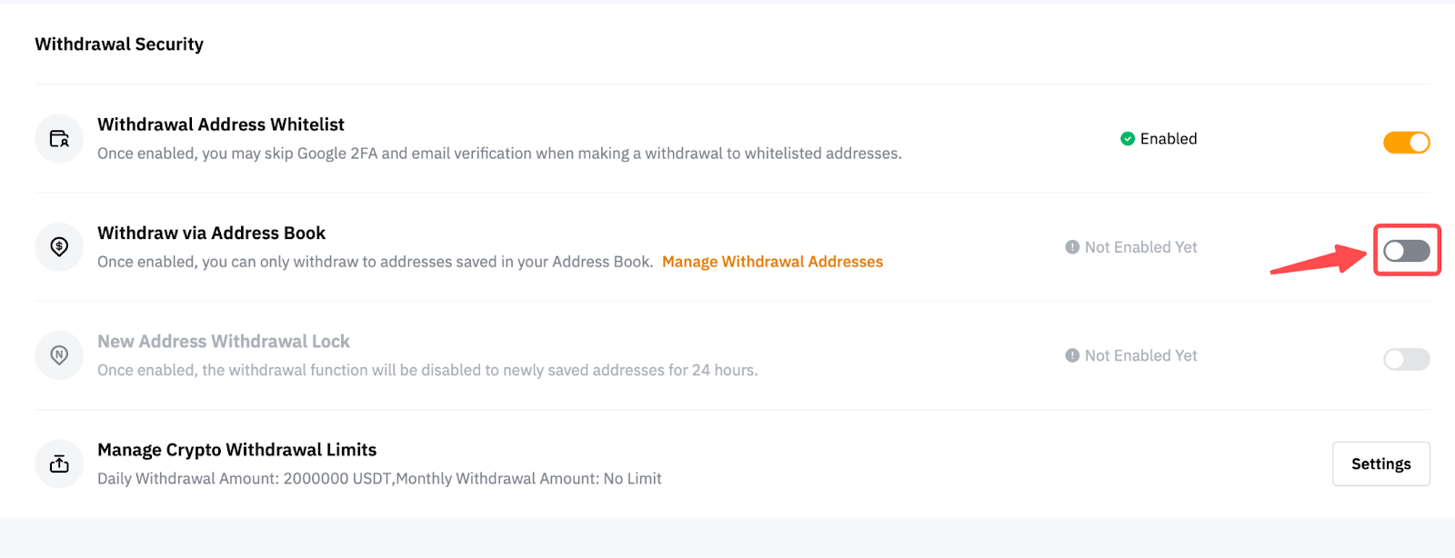 The Withdraw via Address Book function will ensure that only the addresses registered on your Withdrawal Address Book can be used to place a withdrawal request. Therefore, traders will not be able to enter a new wallet address once they enter the withdrawal window.