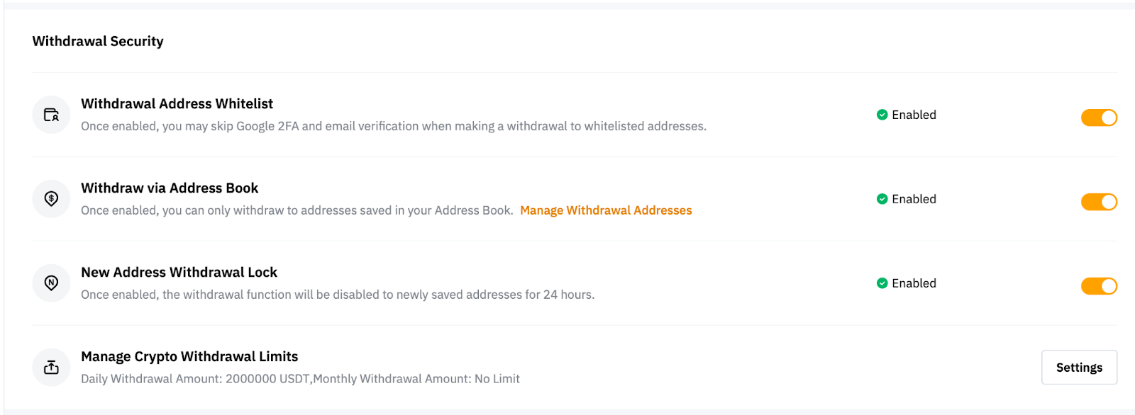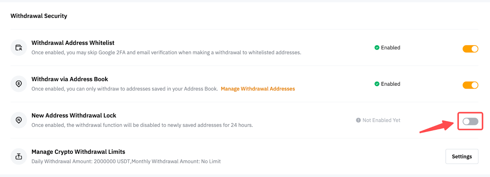 The New Address Withdrawal Lock function will place a withdrawal ban on all new wallet addresses that are added to your withdrawal address book. The lock will not affect addresses that were added at least 24 hours prior to the function’s activation.