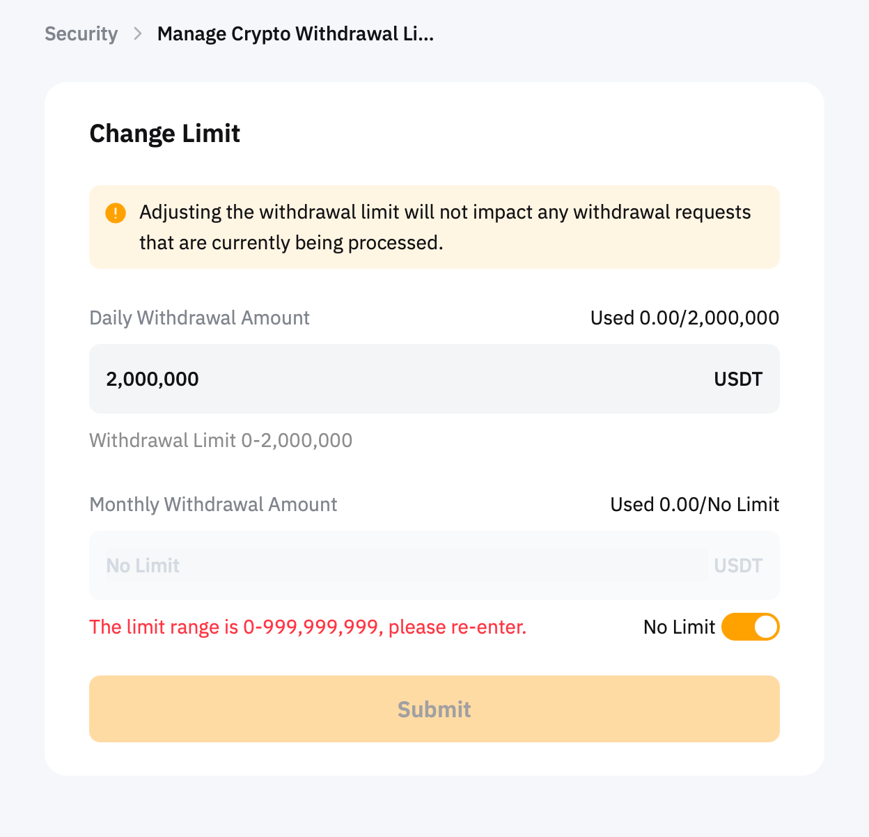To have better control over your withdrawals, you can also set up your own crypto daily and monthly withdrawal limits. Simply input the withdrawal amount for each limit and click on Submit.