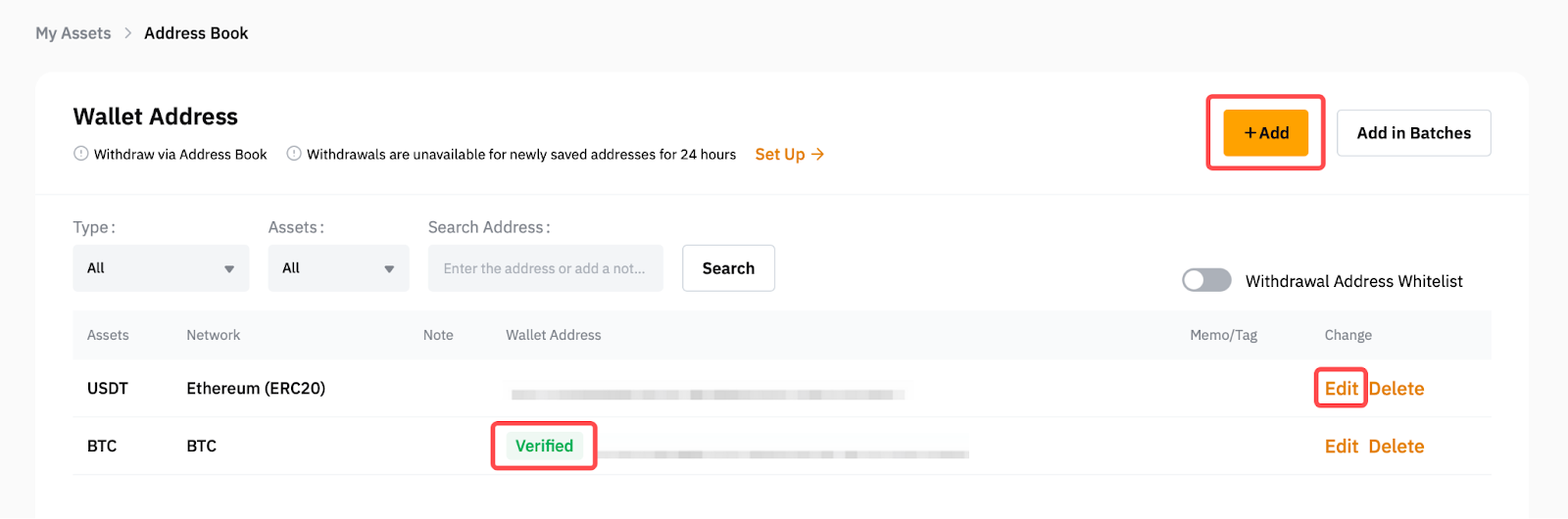 Step 2: Please click on Add in the top right corner of the page to add a new wallet address, or select the wallet address that you want to verify by clicking on Edit.