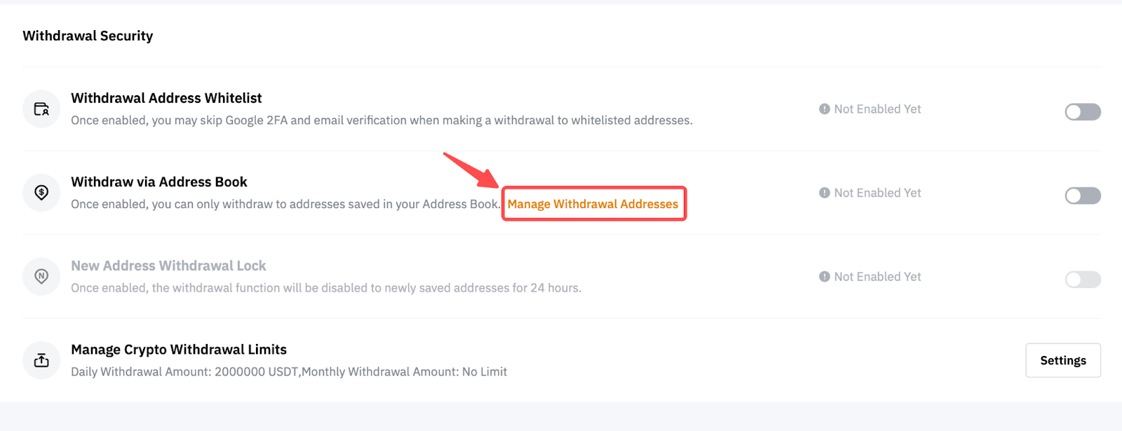 Step 1: To begin, go to the wallet management link provided here, or click on Settings or Manage Withdrawal Addresses on the Account Page.