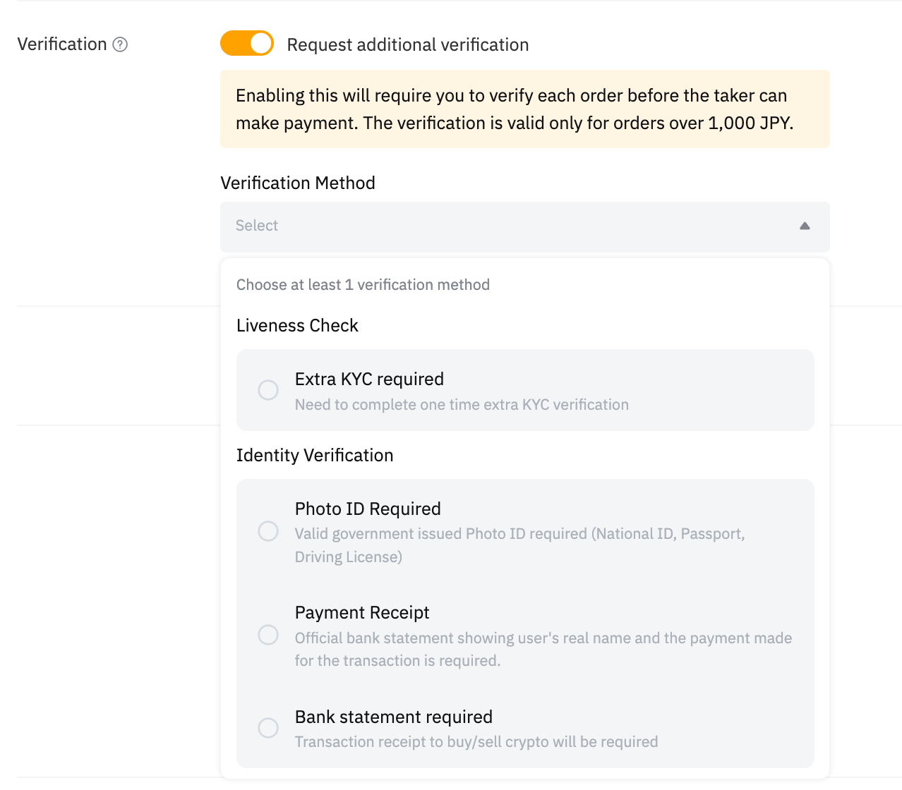 When the Verification Requirement is enabled by the Verified Advertiser (VA), takers are required to complete verification with the advertisers when the order exceeds the specified threshold of fiat currency. Both parties have the right to decide whether to proceed with the transaction during the verification period within the timeframe. Advertisers may request the following proof from the taker in the Order Chat Box: